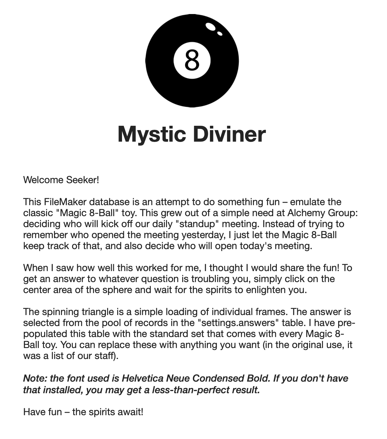 This app grew out of a desire to kick off our daily stand-up meeting at Alchemy Group with a different person every day. Instead of racking my brain about whose turn it was, I created Mystic Diviner to provide me with a random choice that is never a repeat of the previous day.